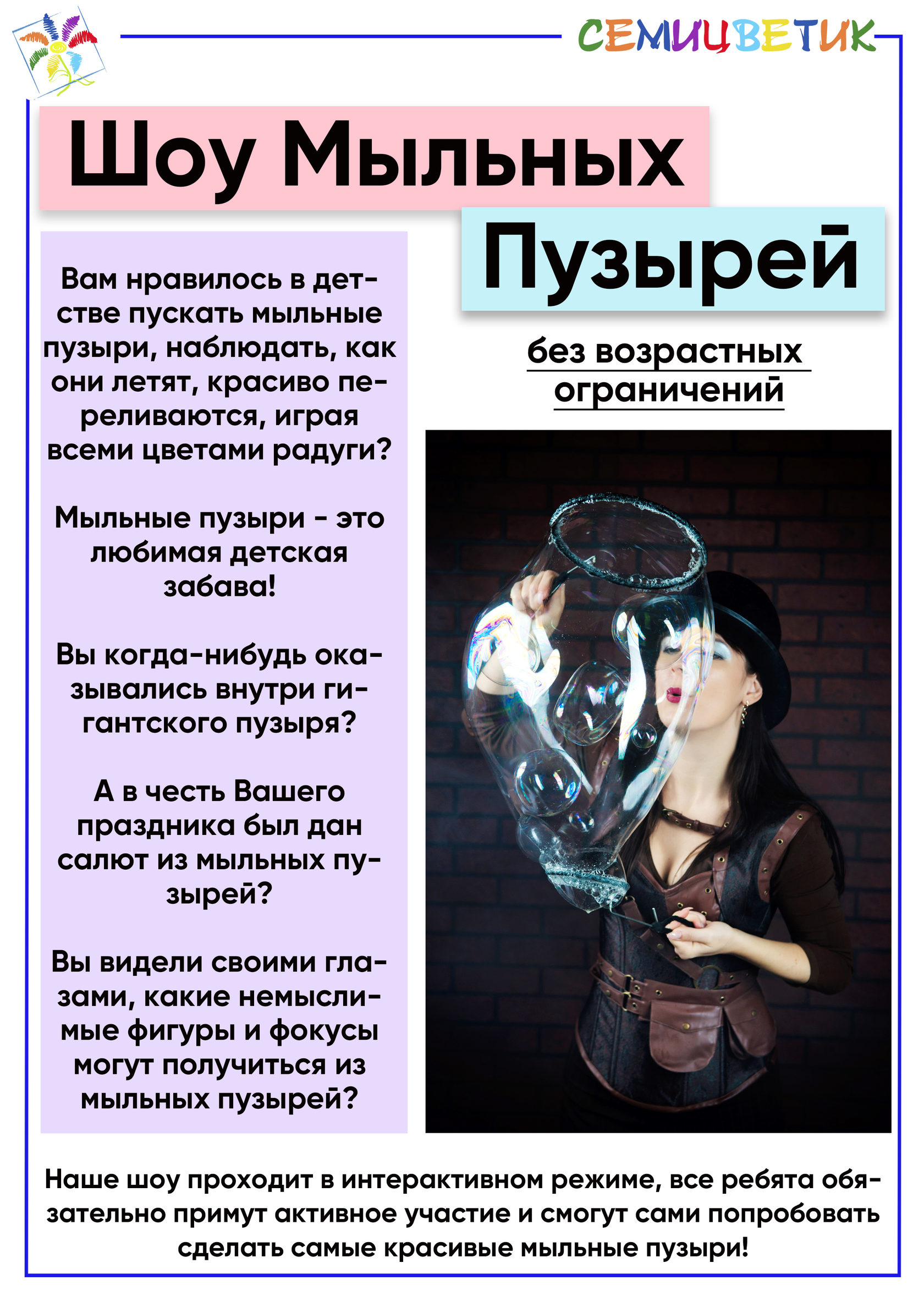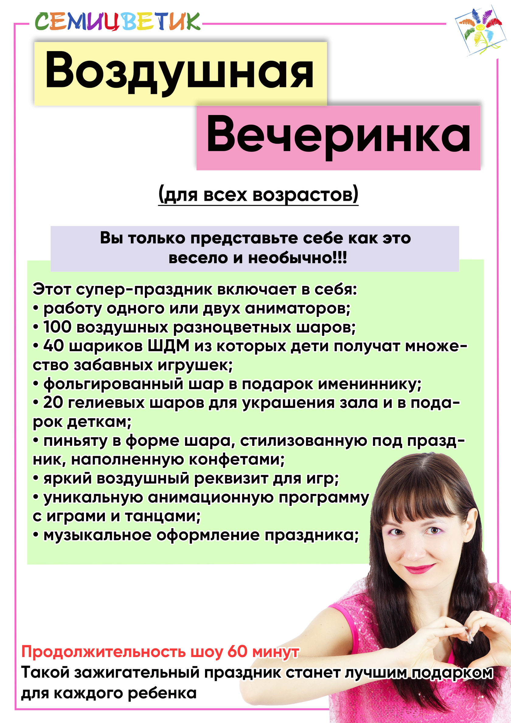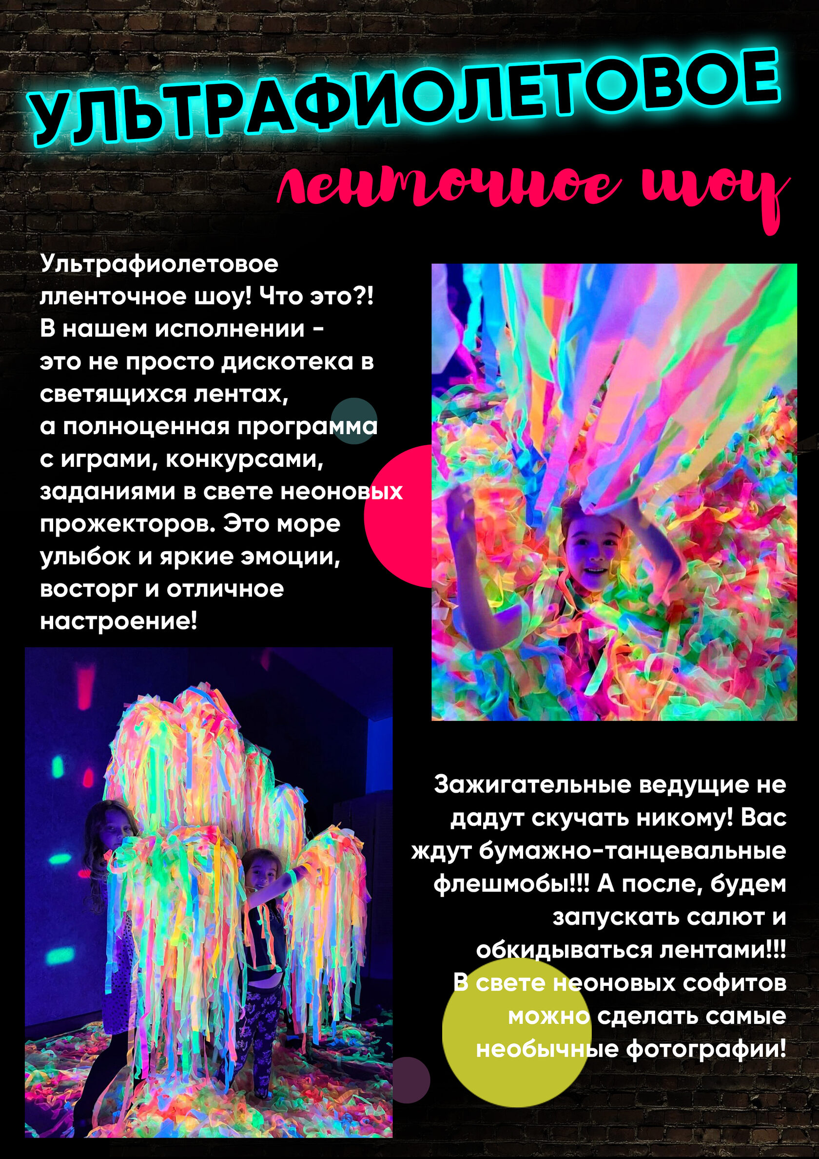 Наши шоу - программы разработаны с учётом возрастных особенностей и интересов детей и взрослых. Мы заботимся о том, чтобы каждый гость получил массу удовольствия и ярких впечатлений.