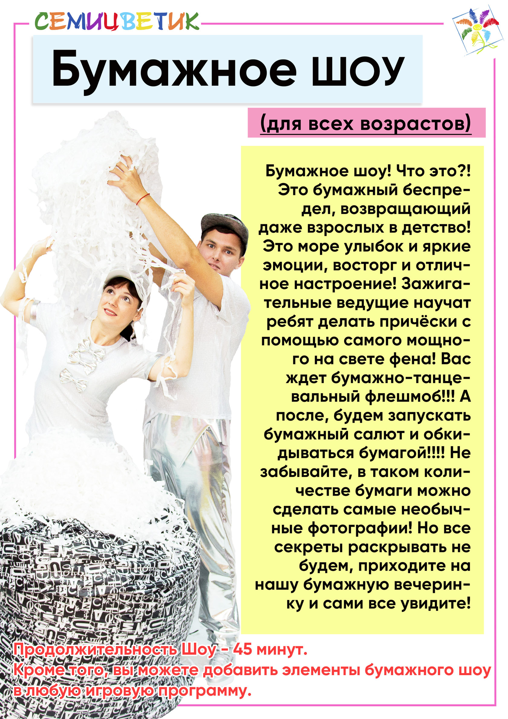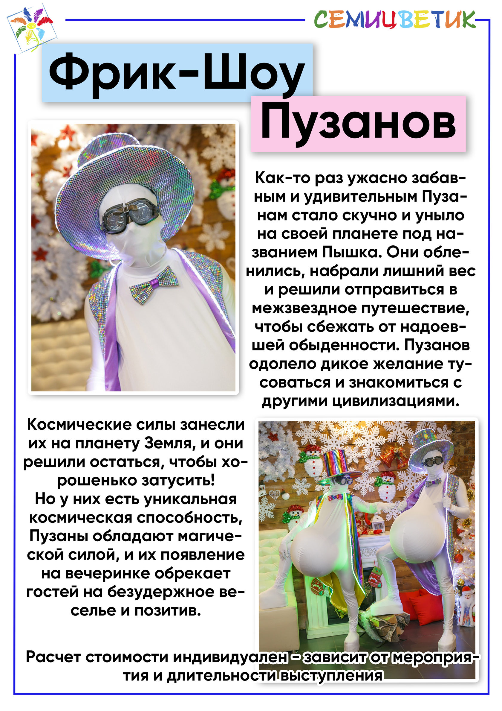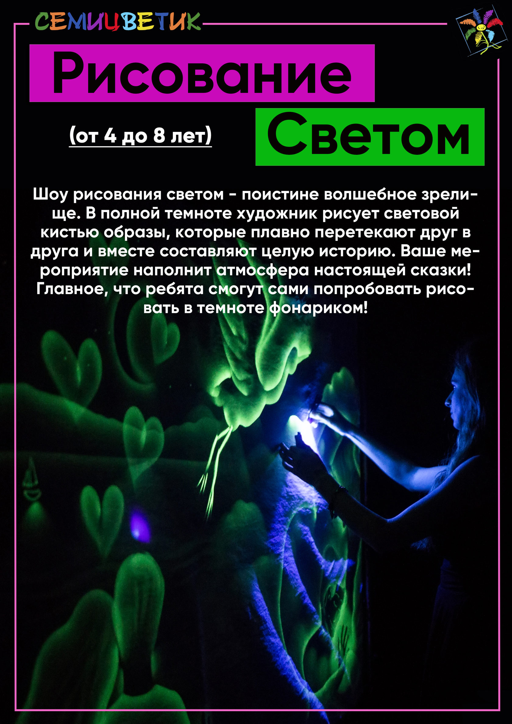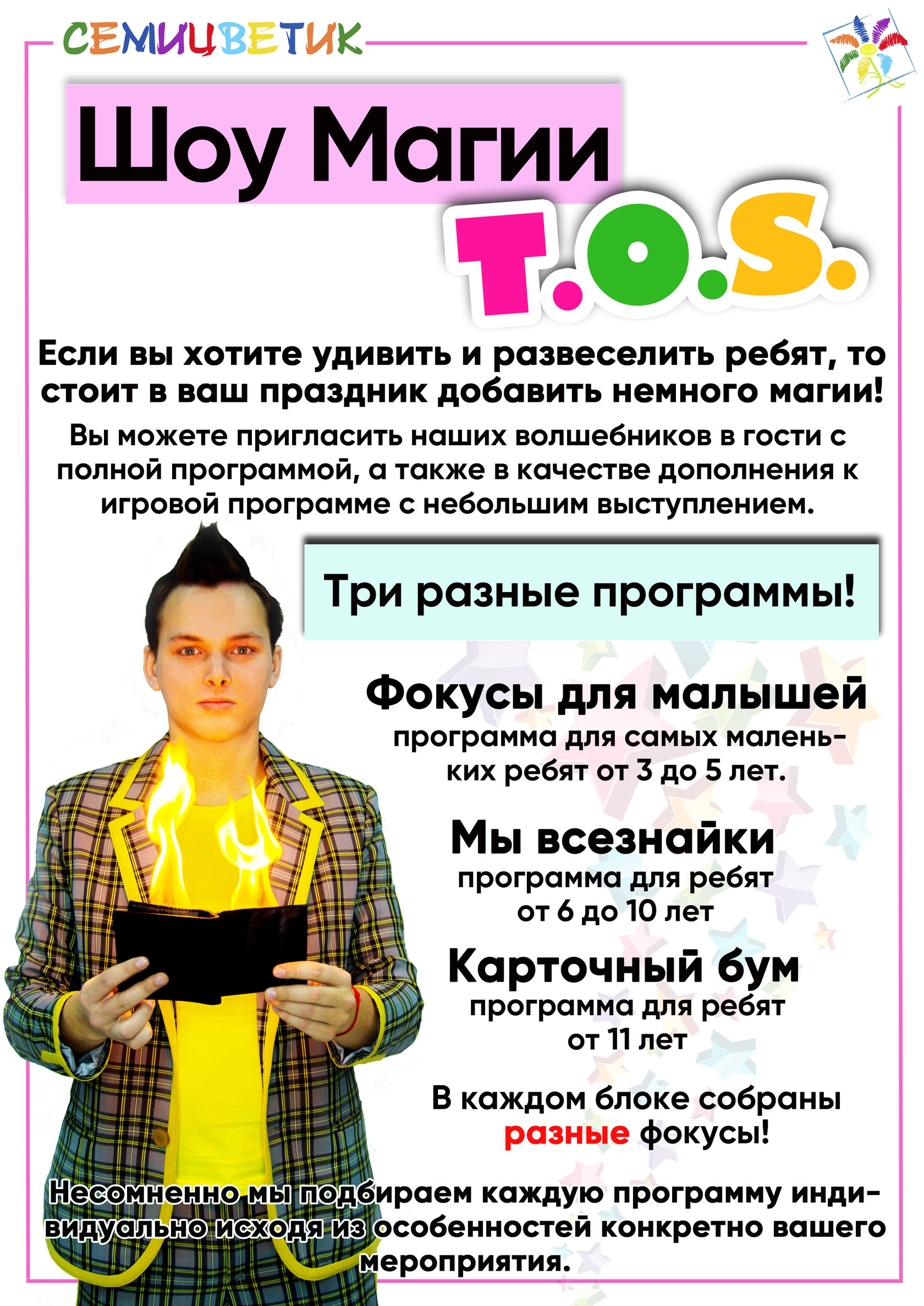 Наши шоу - программы разработаны с учётом возрастных особенностей и интересов детей и взрослых. Мы заботимся о том, чтобы каждый гость получил массу удовольствия и ярких впечатлений.